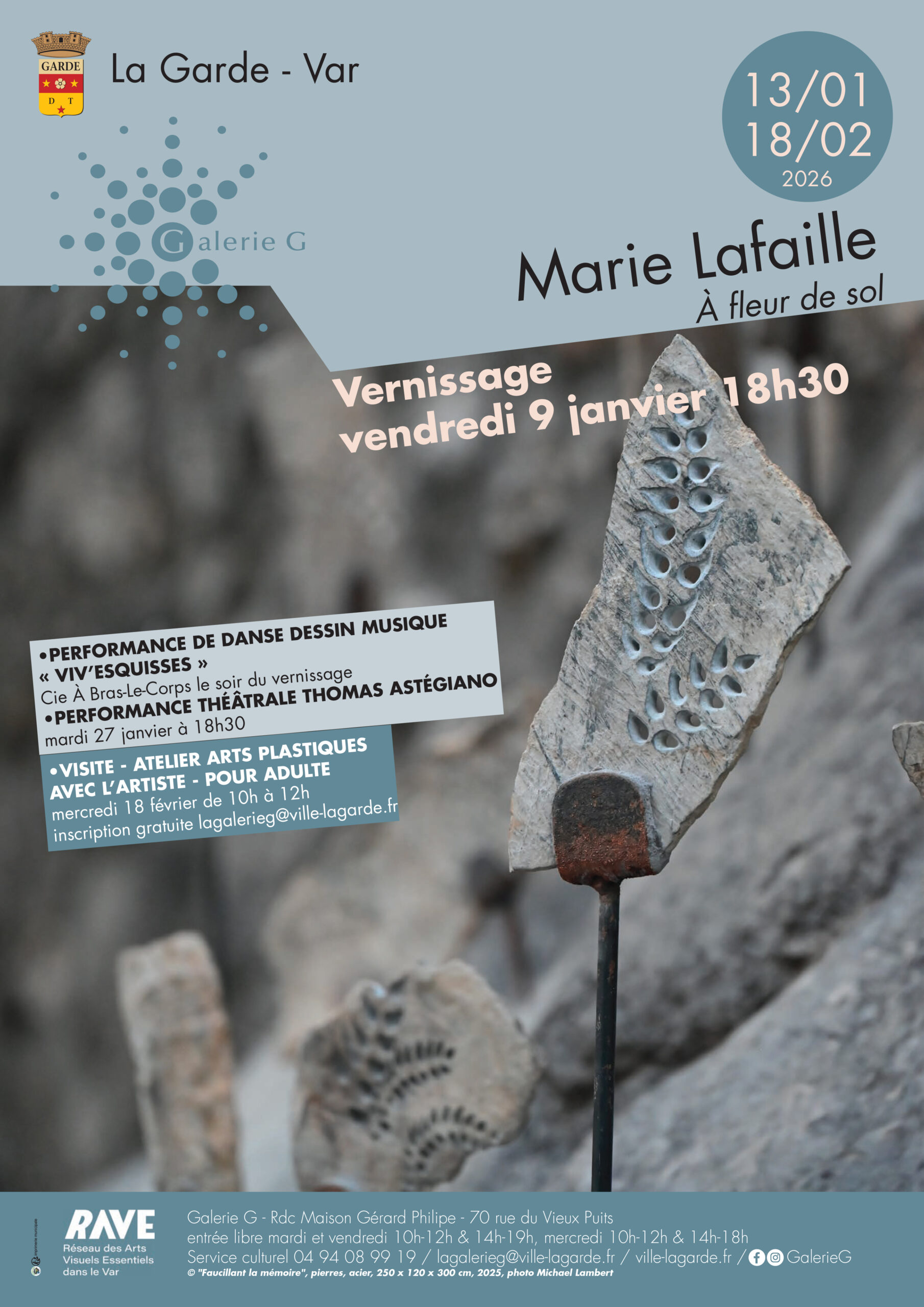 - mercredi 18 février 2026 de 10:00 à 12:00 : visite – atelier arts plastiques avec l’artiste – pour adulte (gratuit sur inscription : lagalerieg[at]ville-lagarde.fr)